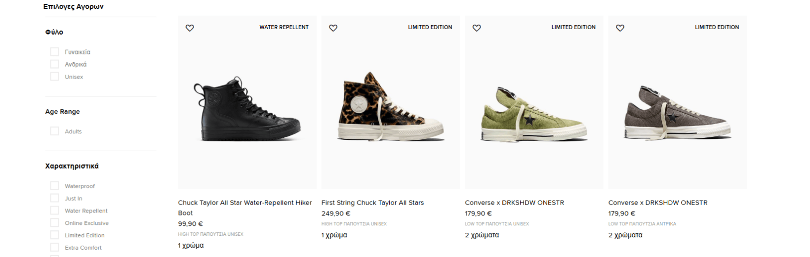 Η Converse.gr αποτελεί την επίσημη ελληνική ιστοσελίδα και ηλεκτρονικό κατάστημα της παγκοσμίου φήμης μάρκας Converse. Είναι ο απόλυτος προορισμός για τους λάτρεις των εμβληματικών All Star και της street κουλτούρας στην Ελλάδα. Στο επίσημο e-shop της Converse.gr, η ομάδα της Fixit έδωσε έμφαση στην ταχύτητα και την αισθητική αρτιότητα. Ο κομψός σχεδιασμός και η εύκολη πλοήγηση αναδεικνύουν τις εμβληματικές συλλογές, δημιουργώντας μια πραγματικά ολοκληρωμένη και ευχάριστη εμπειρία στον χρήστη, από την επιλογή του μοντέλου μέχρι το τελικό checkout.