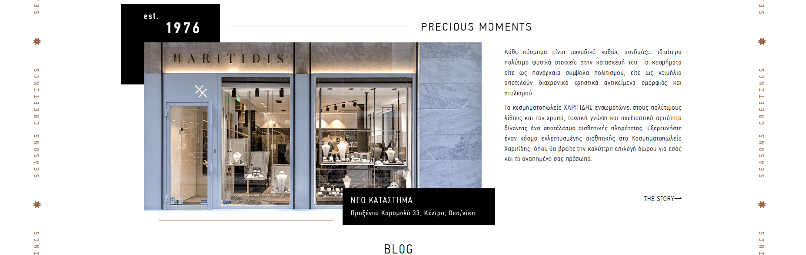 Στο ηλεκτρονικό κατάστημα haritidis.gr, οι επισκέπτες μπορούν να ανακαλύψουν μια εντυπωσιακή συλλογή από χειροποίητα κοσμήματα, δαχτυλίδια αρραβώνων, βαπτιστικούς σταυρούς και ρολόγια κορυφαίων οίκων. Ο σχεδιασμός του custom theme της ιστοσελίδας, καθώς και η πλήρης τεχνική υποστήριξη (support) του e-shop, έχουν υλοποιηθεί από τη Fixit. Μέσα από αυτή τη συνεργασία, εξασφαλίζεται μια premium αισθητική που αντανακλά τη λάμψη των προϊόντων, σε συνδυασμό με μια άψογη, γρήγορη και ασφαλή εμπειρία αγορών για τον χρήστη.